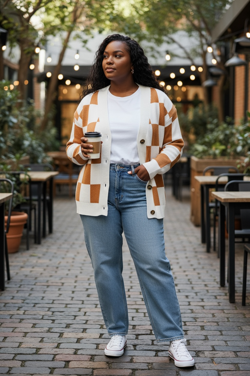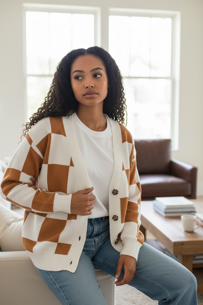 Embrace comfort and style with this checkered button-up V-neck dropped shoulder cardigan. The trendy checkered pattern brings a modern twist...