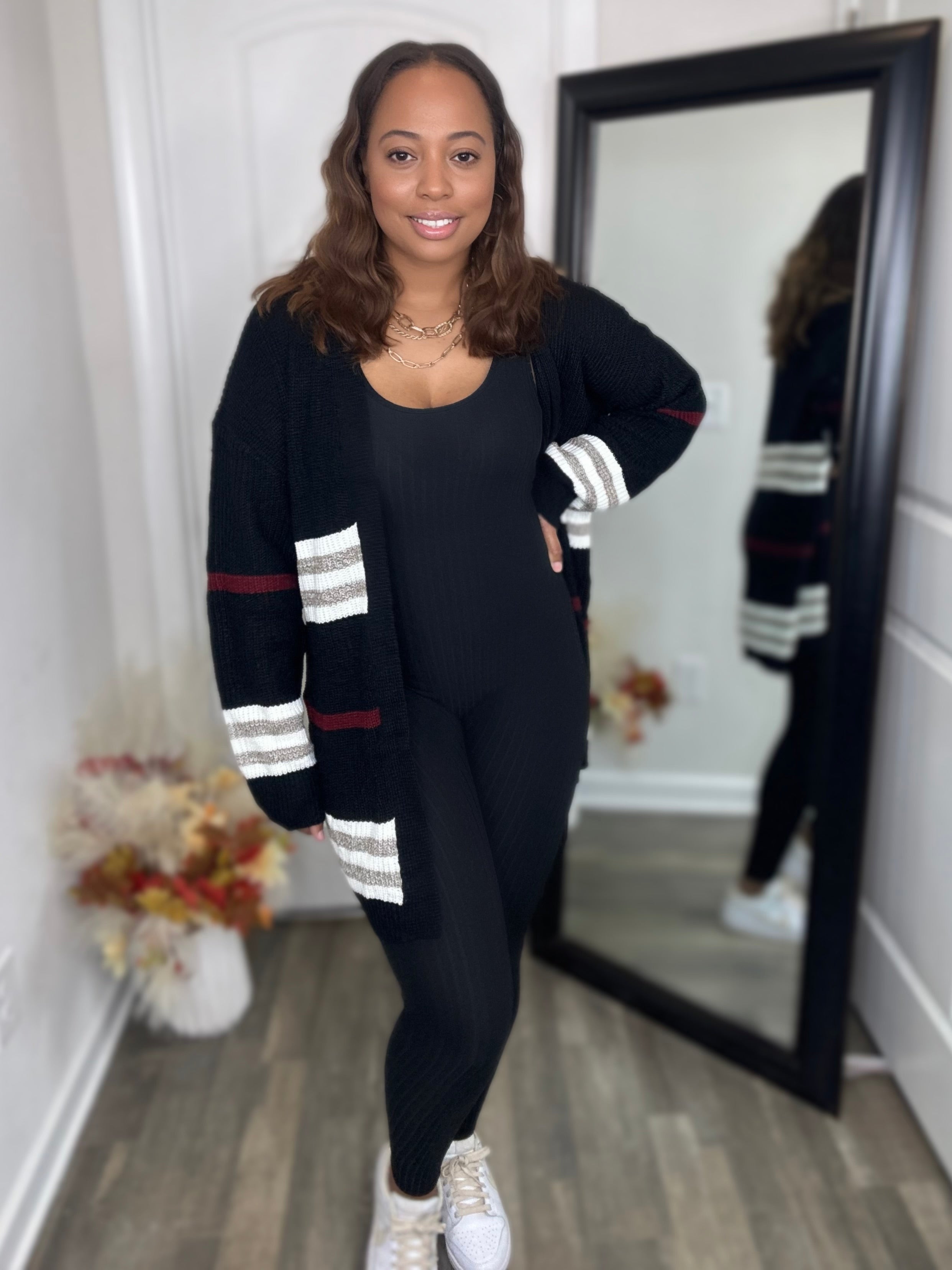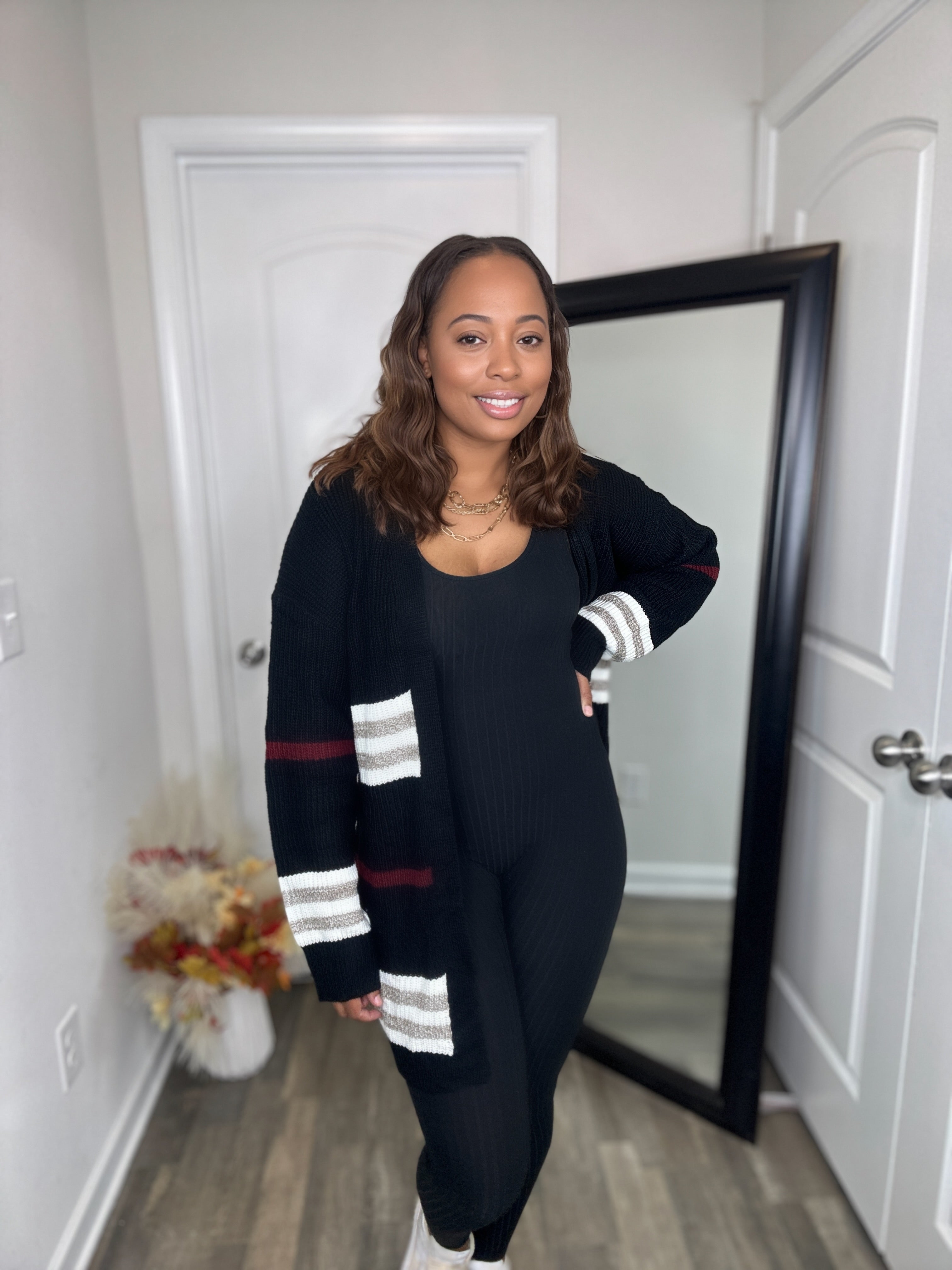 Unmatched Striped Rib-Knit Drop Shoulder Open Front Cardigan
