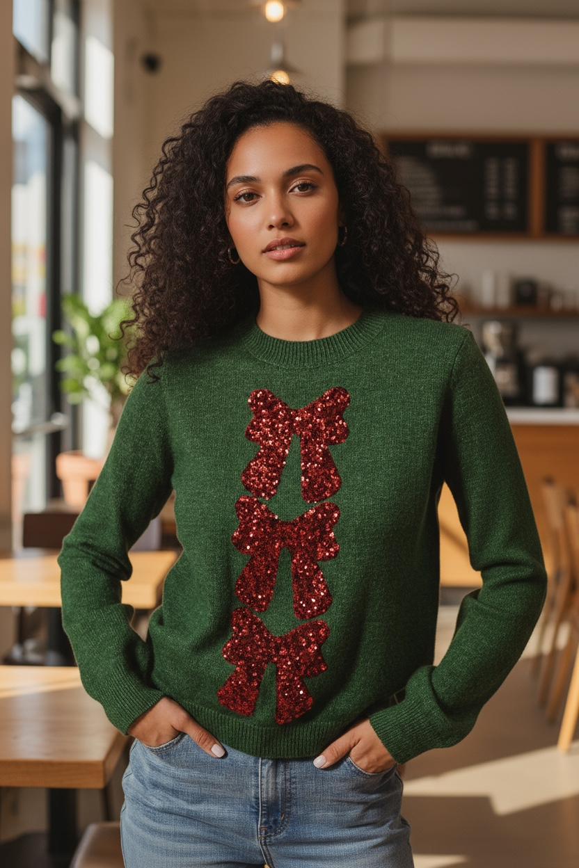 Unmatched Bowtiful Sequin Christmas Sweater - Hunter Green & Red