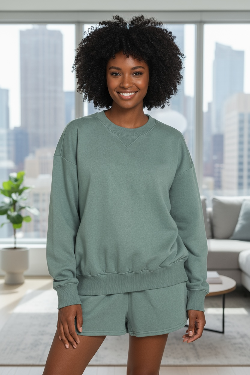 This stylish ash jade lounge set features a cozy oversized crewneck sweatshirt paired with matching comfortable shorts. Made from soft...