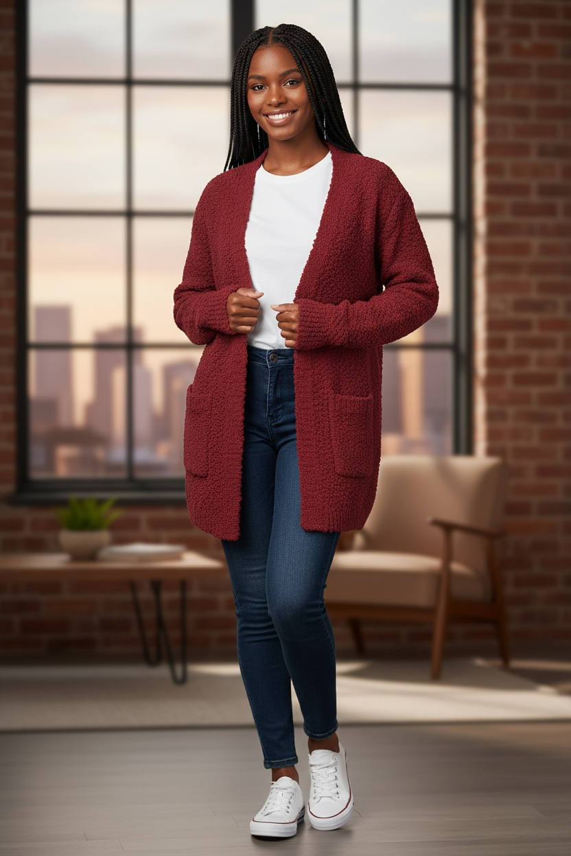 Cozy Long Sleeve Sweater Cardigan with Pockets (Cabernet)