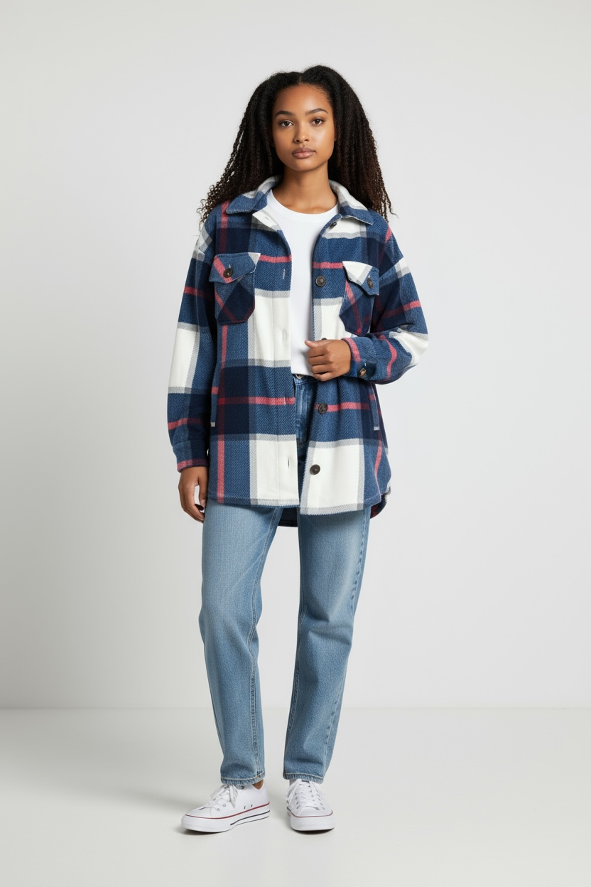 This stylish plaid flannel jacket features a classic button-up design with a timeless navy, white, and red plaid pattern. Made...