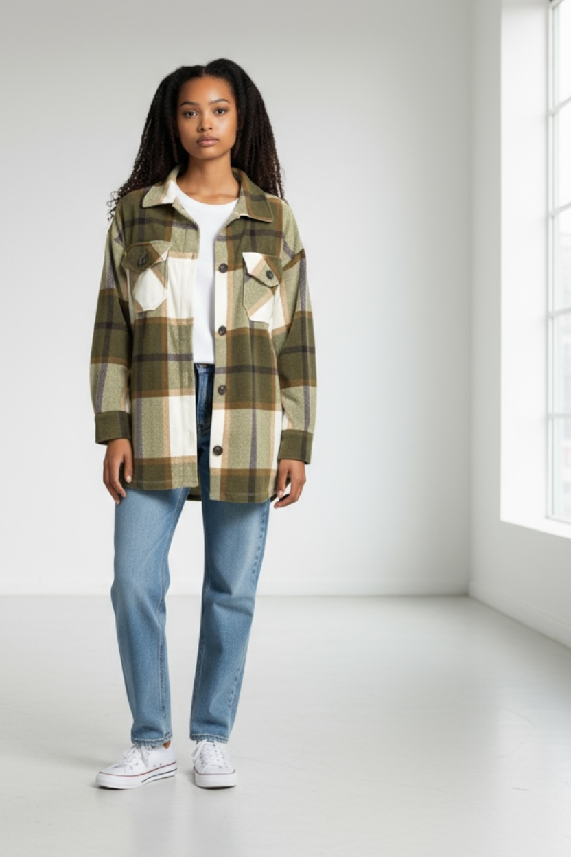 This stylish olive green plaid flannel jacket features a classic button-up design with a comfortable relaxed fit. Made from soft...